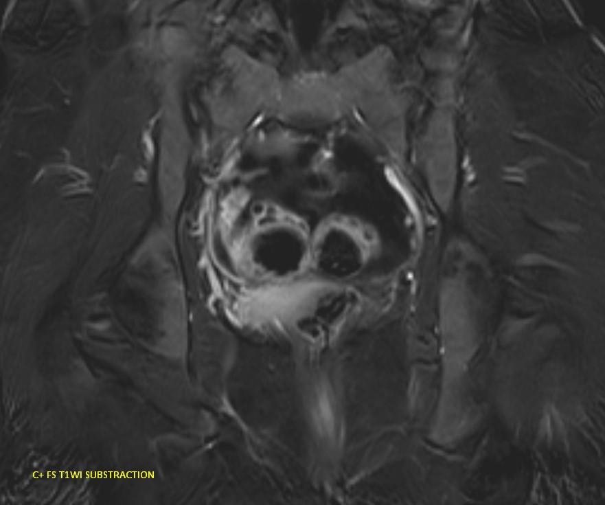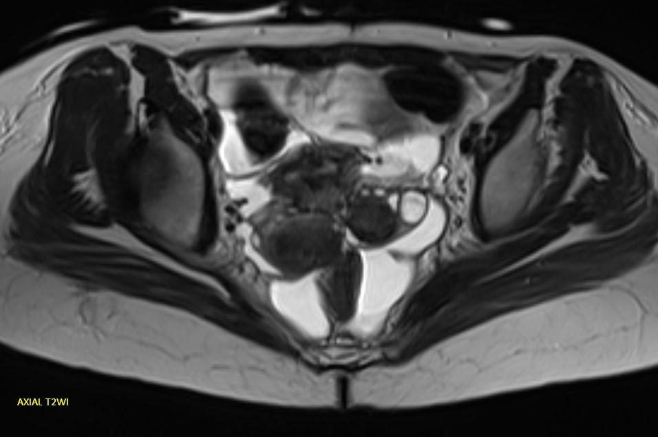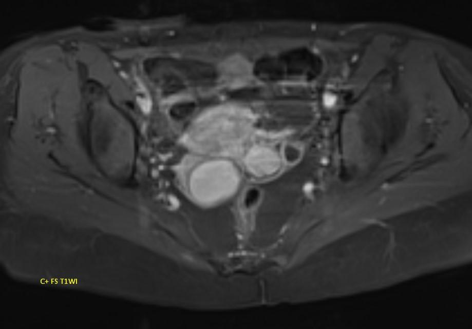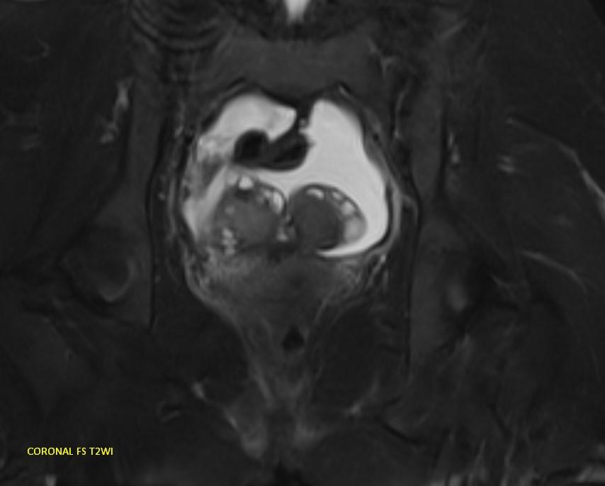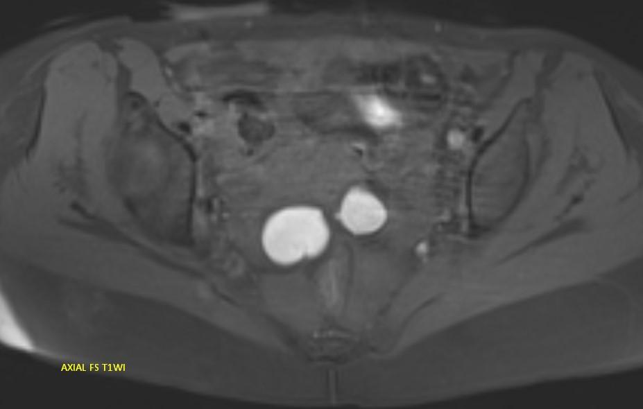 MR images demonstrating the kissing ovaries, bilateral endometriomas (chocolate cysts), and peritoneal inclusion cyst (peritoneal pseudocyst).