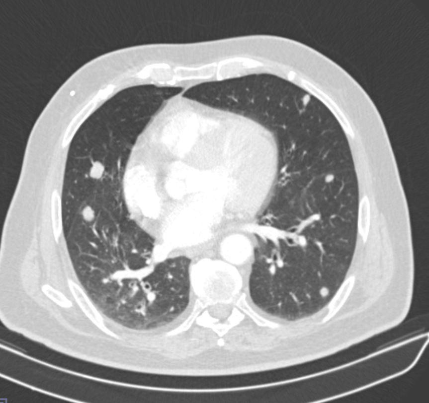 Case of the Week 25 2017 *57-year-old male. What is the most likely diagnosis? Answer Answer: Non-mucinous bronchoalveolar carcinoma and bilateral metastatic pulmonary nodules Kategori:Cases Önceki yazı Case of the Week 24 2017 Sonraki yazı Case of the Week 28 2017