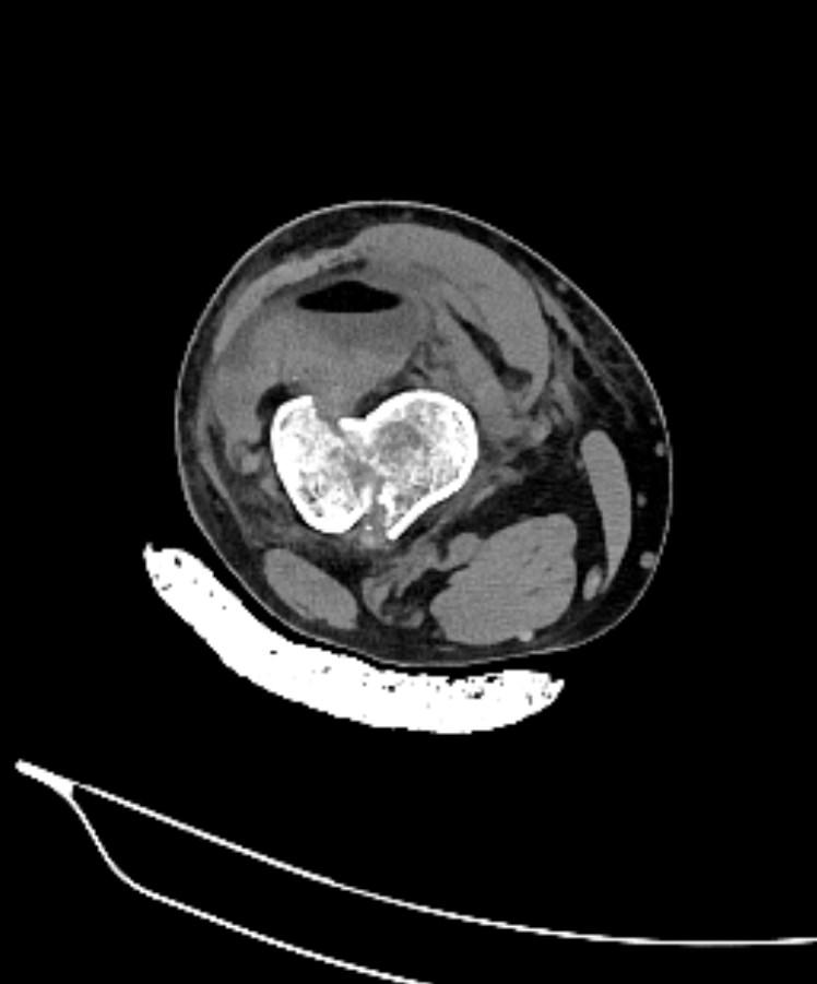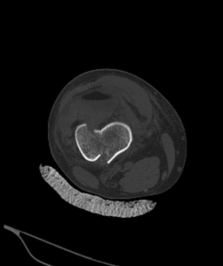 CT images of the knee revealed a displaced fracture of the distal femur and lipohemarthrosis with a fat-fluid interface.
