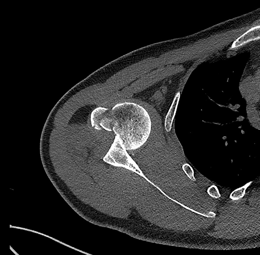 CT images of the right shoulder revealed anterior shoulder dislocation with displaced fracture of the greater tuberosity and lipohemarthrosis.
