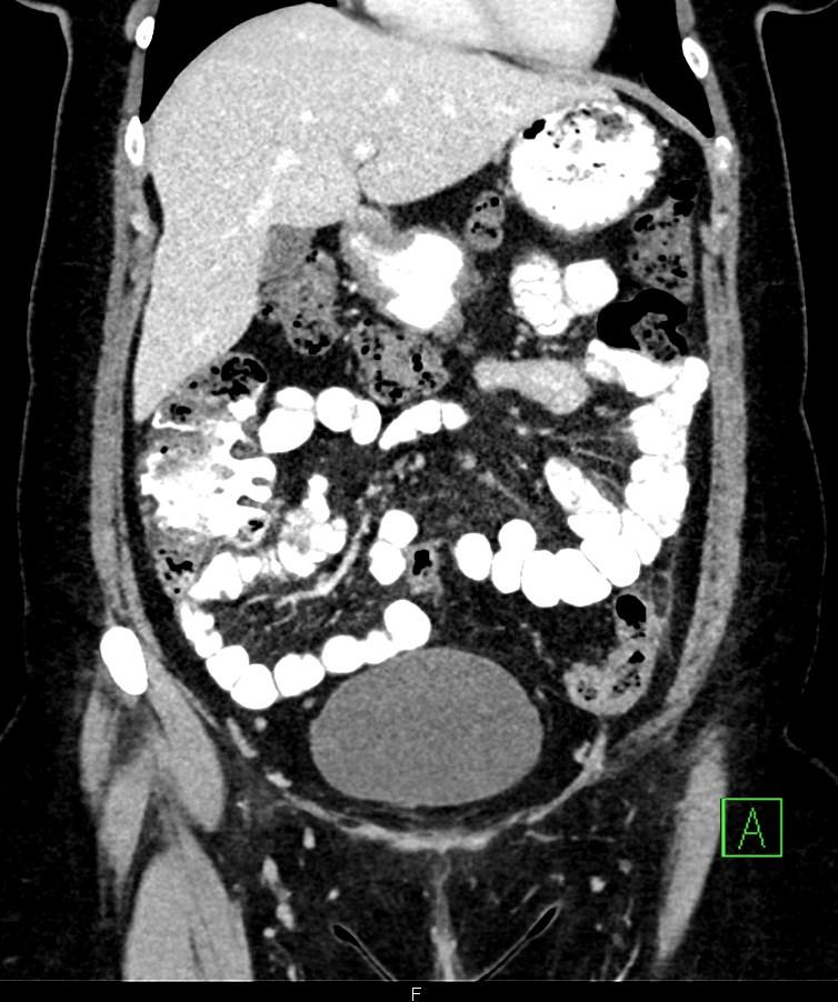 Omental infarction has a clinical presentation similar to that of epiploic appendagitis. However, imaging illustrates an inflamed fatty mass, larger than in epiploic appendagitis and lacking a hyperdense ring on CT [1].